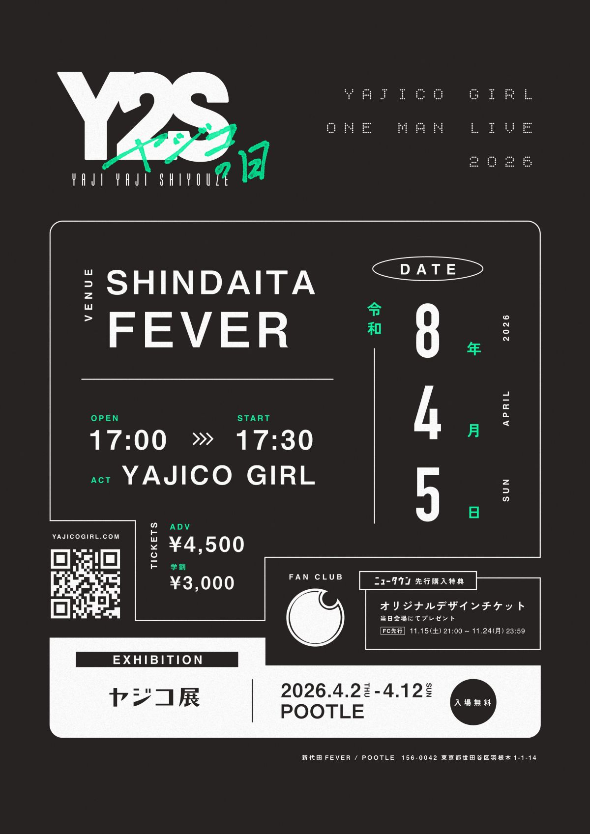 令和8年4月5日(日)に新代田FEVERにて「YAJI YAJI SHIYOUZE - ヤジコの日 -」の開催が決定!只今よりファンクラブ「ニュータウン」会員限定のチケット先行がスタート!